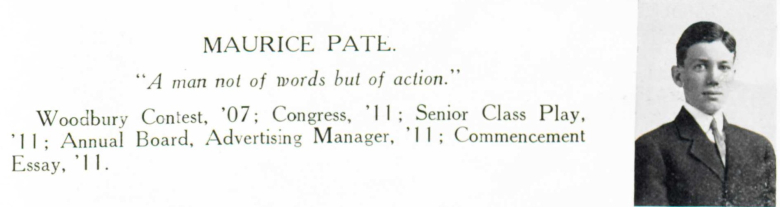 Maurice was born in Pender, Nebraska, in 1894 to farmers Richard and Rachel Pate. Maurice was the eldest of seven children, but three of his siblings died as infants. They died of polio, diphtheria and an illness caused by unpasteurized milk. Maurice's family moved to Denver when he was only three years old, and he spent the rest of his childhood there. In grade school, Maurice was given the opportunity to skip fourth grade and move directly to fifth. After completing middle school, he attended East High School where he participated in a number of activities including drama, the school newspaper and various competitions. Maurice's motto was, "A man, not of words, but of action." This motto would guide the rest of his life.
