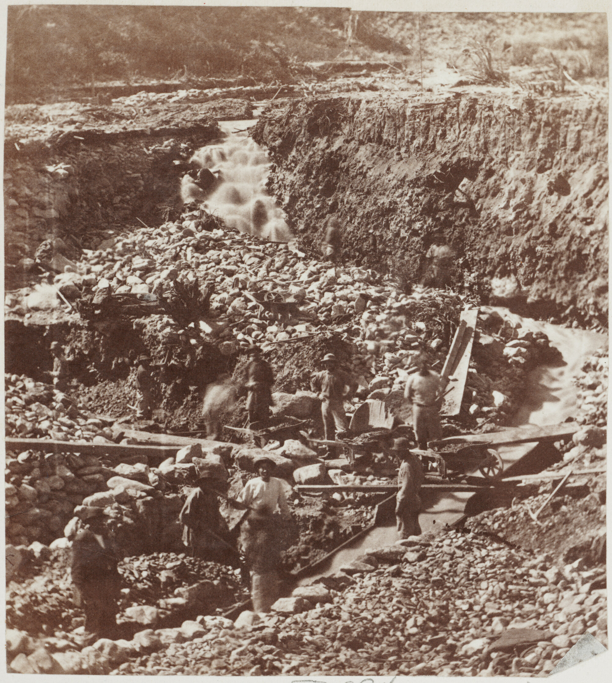 View of a hydraulic mining operation at Chinese Gulch, in (probably) Colorado; shows men working, eroded ground, sluices, and wheelbarrows.