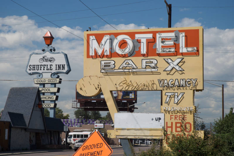 In the early post-World War II era, Colfax was a vital East-to-West avenue, especially for those intent on a mountain vacation or recreation. Much of Colfax became a seat of hotels and motels, restaurants, and entertainment spots, where travelers and residents alike might rest, eat, and be entertained. Development of Colfax seen in the 1930s, when the street was designated U.S. Highway 40, paled in comparison to the boom in construction during the 1940s, including a spate of motels, restaurants, and clubs from the 4400 block of Colfax through Lakewood. But with this new, automobile-oriented face to Colfax Avenue, several of the causes for its subsequent decline were put in place. Colfax was widened, and widened again, and again, to accommodate increased automobile traffic, and boulevards were lost to new lanes of traffic. Businesses were oriented to those who traveled by car, not those on foot from within a neighborhood. With the construction of the interstate system, travelers no longer used Colfax as means of passing through Denver to destinations east or west, and the short-lived golden age of Colfax Avenue passed. Unfortunate zoning, loss of trade, and a less-than-hospitable pedestrian environment further contributed to decline.