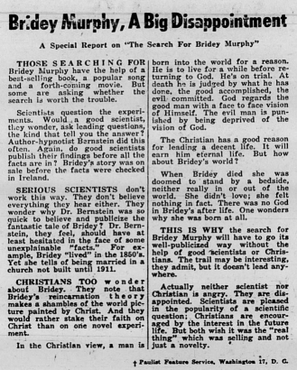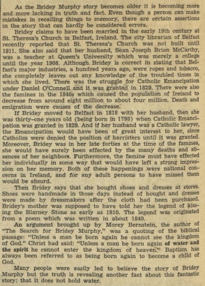 Funny how memory works. I would have sworn that I heard about Bridey in 1953. I have always associated it with a house my family lived in from the summer of 1952-to the summer of '53 (10 years old). Like everyone else, I wanted it to be true. It was a decade later when I discovered Bridey's facts were fallacious.