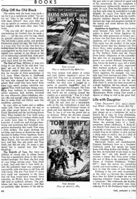 Spent all of one summer vacation (abt 1957) as a youngster deeply immersed in Tom Swift Jr. books. Can't remember how many I read but it was a lot. My parents were worried about me. I wasn't playing with friends. I didn't care.I had space friends and other more interesting adventures with Tom and even his Dad. This article really brings back memories.