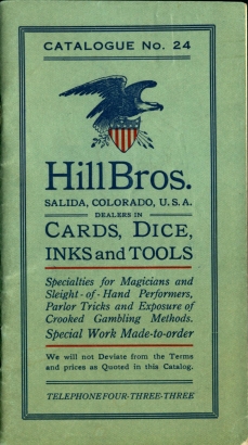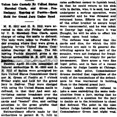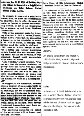 You may wonder whether selling such goods was actually legal—I know I did. Turns out, there was apparently some dispute about that at the time. In earlier ads (which I was sadly unable to acquire), the brothers apparently brashly trumpeted (or at least strongly implied) how much money could be made at “sporting parlors” with a rigged deck, a little sleight of hand and a certain level of disregard for personal safety. This style of advertising brought them some unwanted attention, culminating in the April 1912 arrest of Myron E. and Lawrence A. Hill on charges of using the mail to defraud.