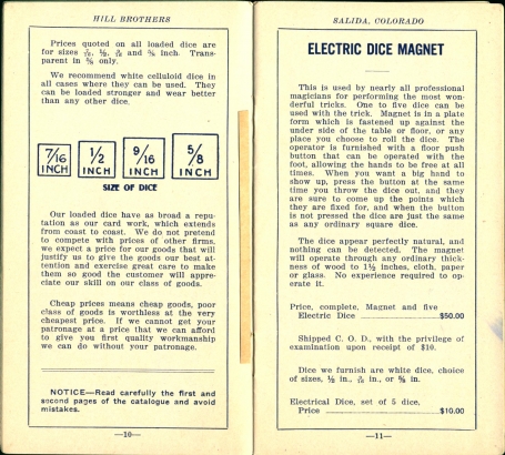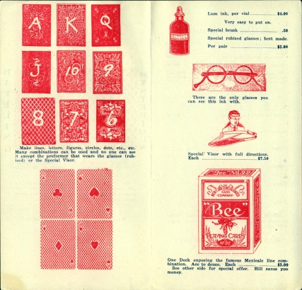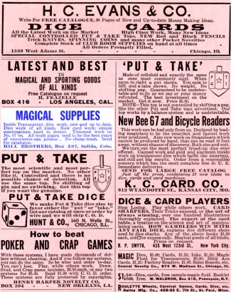 Donning the guise of “Magical Supplies,” and purporting to be a means of “exposing crooked gambling methods” is a catalog chock-full of the tools of a rather nefarious trade. Despite numerous disclaimers scattered throughout its pages, these items are clearly designed to perform only one trick…magically transferring the contents of another’s wallet into your own.