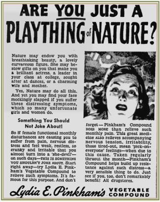 In the not too distant past, I posted a blog exploring several aspects of old-time advertising. In addition to being great fun to research and discuss, it was also quite well-received. As such, I’m quite pleased to report that the topic will be a recurring theme in my blogging itinerary, but with a bit more of a focused approach rather than the sweeping and all-inclusive tack taken in the first entry. With that, let’s talk about some “female weaknesses,” shall we..?