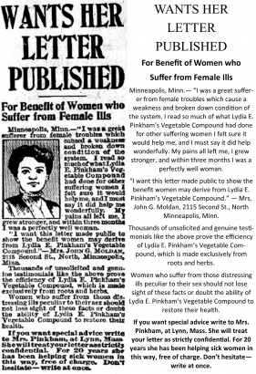 Another thing which set the product apart from many of the other remedies on the market was that it was actually somewhat efficacious (or at least not harmful). That’s not to say that it treated or cured every ailment it wound up being associated with (based largely on testimonials… a subject for another time), but in terms of relieving discomfort associated menstrual cramps or menopause, there’s some evidence it was actually successful. The fact that it was roughly 20% alcohol probably didn’t hurt its sales, either—particularly during prohibition. Unlike some of their counterparts, the fact that they were able to show some redeeming medicinal value to their potion allowed them to keep selling it even during the reign of the Volstead Act.