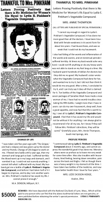 As with many other tonic purveyors of the patent medicine industry, the formula itself wasn’t actually patented (only the packaging), leaving them free to alter the composition of the compound if needed. One aspect of the treatment that did set it apart from many of its contemporaries, however, is that it didn’t begin as a money-making scheme. Lydia had been providing her medicinal compound to her friends and neighbors for years, free of charge. A real estate crash in 1873 left her husband (and by extension, her) in deep financial trouble, leading to her apparently reluctant decision to put her product on the open market. Whatever recalcitrance she may have initially held, it apparently quickly faded away.