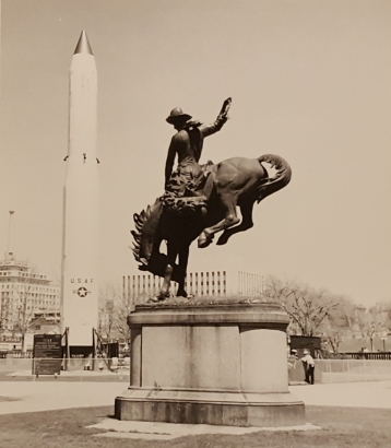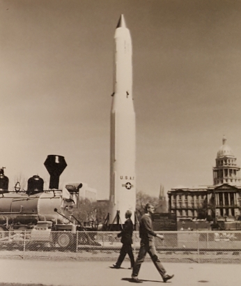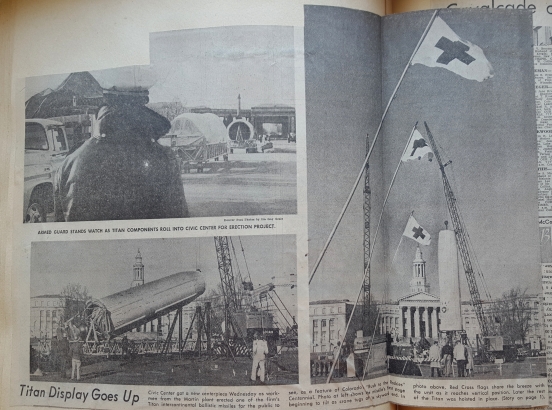 TITAN: The mighty intercontinental ballistic missile in first public showing in world towers over Pioneer Village in Denver’s Civic Center as symbol of “Rush to the Rockies” from 1859 to the Space Age. [sic]