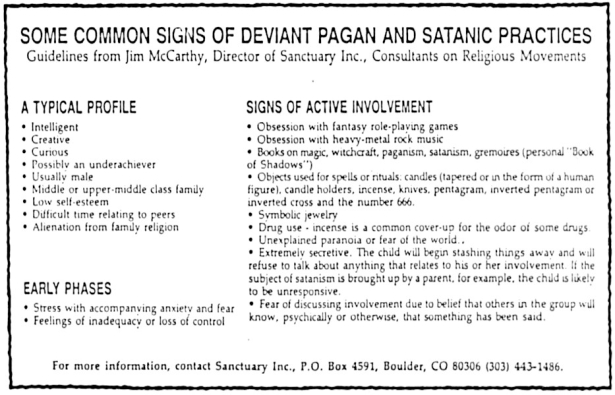 Sanctuary Inc.’s “signs of deviant Pagan and Satanic Practices” appeared in publications all around the state. The typical profile included things like teens being intelligent, creative, curious, and alienated from the family’s religion. Their signs of active involvement listed interests such as role-playing games, incense use, candles, and heavy metal music. Based on this type of overbroad criteria, it would be difficult not to define all teenagers as aspiring cultists. Such sweeping warnings obviously had a positive impact on the bottom lines of self-described deprogrammers and teen treatment facilities.