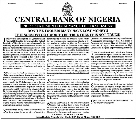 Thank you for putting together this article. It's quite interesting to know the history of the so often received Nigerian prince (or princess) e-mails and see how it played out for one individual in history.