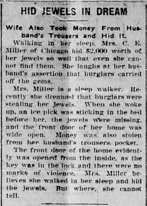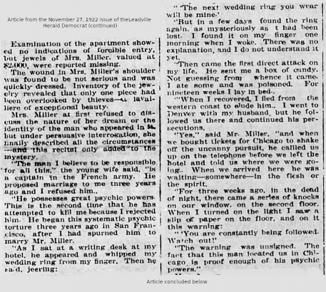 Strangely, for a story built on such a solid foundation, there were a number of discrepancies within the articles. For example, Mr. Miller alternately claimed the attacker was a dentist, a doctor or a French Army lieutenant. The couple declined to reveal the psychic assailant’s name to the police and the press. There was also the matter of either $1,200 or $2,000 worth of missing jewelry, as well as all traces of cash missing from Mr. Miller’s trouser pockets. The only piece of jewelry that remained untouched was a lavalier, which had been a gift to Mrs. Miller from the mysterious foe. (I just got chills. Did you get chills?)