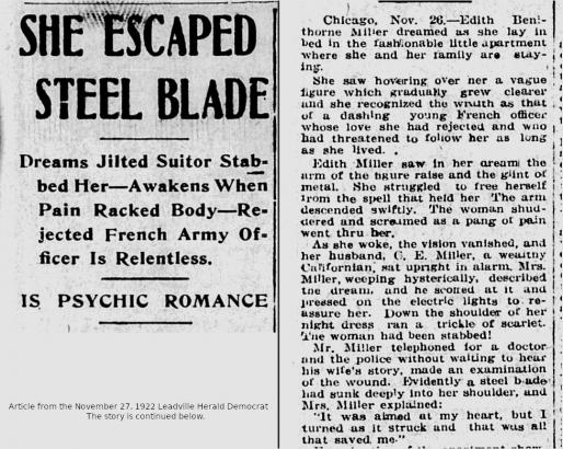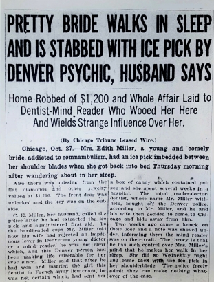 As initially reported on October 27, 1922, Mrs. Edith Miller was stabbed in the shoulder by a spurned lover with either an icepick or a kitchen knife. The wound wasn’t serious, and the story would hardly be worth mentioning, save for a couple noteworthy details. First, Mrs. Miller was apparently sleepwalking at the time, and second (and arguably more importantly), the spurned lover in question was in Denver – roughly 1,000 miles from the Miller’s Chicago residence – at the time of the attack. This may seem like a fairly solid alibi to the uninitiated, but Mr. C. E. Miller attributed this to the would-be suitor’s psychic powers. Just to make this explicitly clear, the Millers claimed that while Edith was sleepwalking, she was psychically assaulted in her dream by her rejected paramour, who was wielding a real-life ice pick. Eat your heart out, Freddy Krueger.