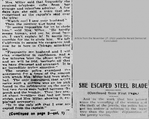 Mrs. Miller, for her part, claimed in an interview that her assailant was in fact a captain in the French Army. Angered that she had rejected his marriage proposal in favor of Mr. Miller, he had accosted her twice before. The first attack had happened three years earlier, when the newlyweds lived in San Francisco. The captain/lieutenant/doctor/dentist appeared to Mrs. Miller telepathically, whipping her wedding ring from her finger, and declaring, “The next wedding ring you wear will be mine!” before disappearing. (The ring allegedly reappeared on her finger a couple days later, with no explanation.) The second assault was far more mundane, as he simply had a box of poisoned chocolates delivered to her. (No word on whether the chocolates were psychic.)