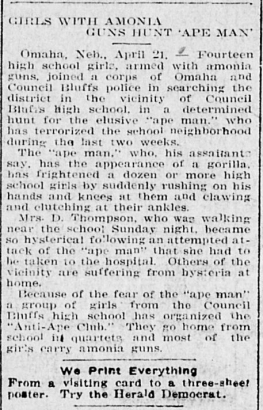 While this may sound like the plot of a Bert I. Gordon film, law enforcement at the time took the matter seriously. The Ape-Man remains at large.