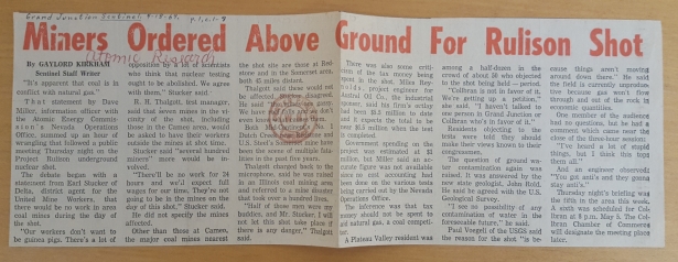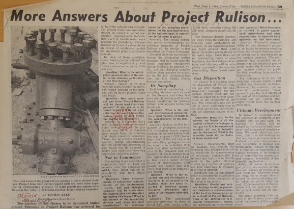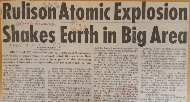 In the late 1960s, the United States government conducted a series of underground nuclear tests under the name Operation Mandrel. Also in the late 1960s, the United States government was trying to figure out a way to use nuclear warheads for peaceful, constructive purposes under the name Project Plowshares. On September 10, 1969, in a small western slope community located just north of I-70 between the towns of Parachute and Rifle, these two distinct entities joined forces for Project Rulison.